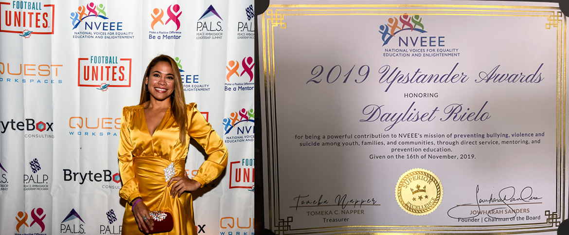 On November 6, 2019 at Florida International University during it's 10th Anniversary Celebration, Nveee awarded Attorney Rielo with it's Upstander Award for her powerful contribution in assisting to bring awareness against Bullying and Suicide and Violence among Youth, Families, and Communities through Direct Service, Mentoring, and Prevention Education.
